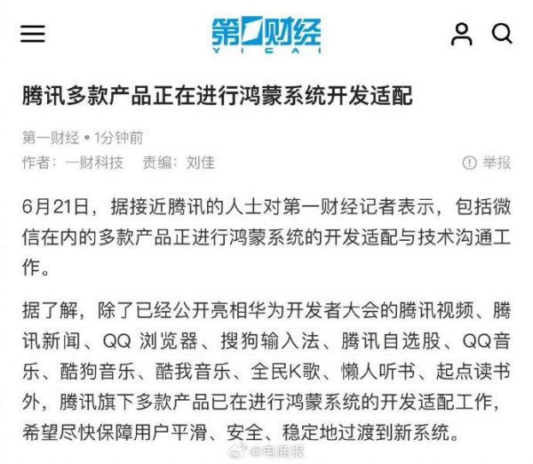 纯血鸿蒙要来了,腾讯多款产品也正在进行鸿蒙系统开发适配。