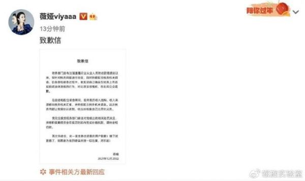 随后,薇娅发布声明向公众致歉,并表示“愿意为我的错误承担一切后果”。