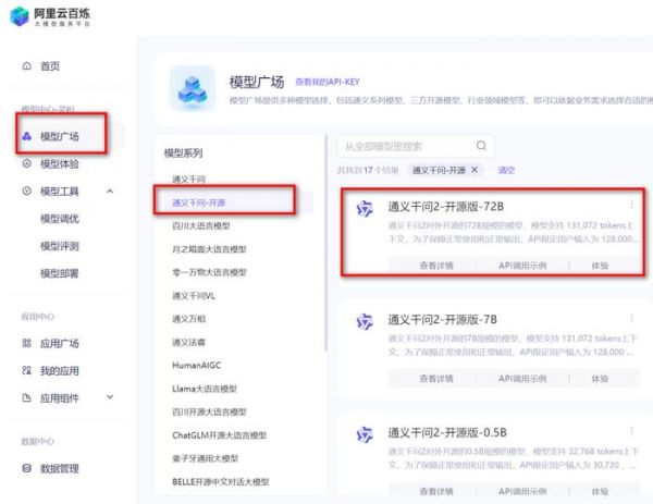 然后进入模型广场,选择开源模型,我必须说,自从阿里云千问开源之后,我就像一个渣男一样,放弃了以前一直在用的开源模型,投入了千问的怀抱