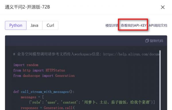 选择你想要的模型,然后点击API调用示例,然后选择查看我的API-KEY,如果以前没创建过,那就可以直接创建新的API-KEY,而且阿里百炼平台也提供了代码参考,这样就可以轻松开始使用千问2的API实现各种奇思妙想的创意了。