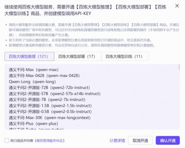 弹出窗口里面确认一下,我们要开通大模型推理、大模型部署、大模型训练等商品;