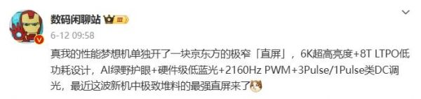 屏幕方面,真我GT6将配备一块京东方的极窄「直屏」。这款屏幕峰值亮度达6000尼特,支持8T LTPO技术、AI绿野护眼、硬件级低蓝光、2160Hz PWM调光和3Pulse/1Pulse类DC调光,号称“最近这波新机中堆料最猛的直屏”。