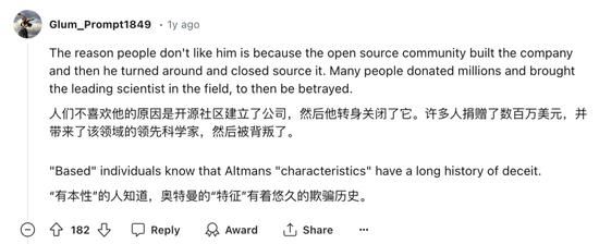在网友看来,嘴上全是主义,心里全是生意。更有甚者跑到奥尔特曼账号的评论区大骂他是“liar(骗子)”。专栏作家Edward Zitron在自己的博客中直接写了一篇名为《Sam Altman Is Full Of Shit》的文章。在国外社区reddit,还有网友专门建了一个话题区叫做“为什么奥尔特曼这么讨厌?”,这个话题下引发了网友的百条评论。