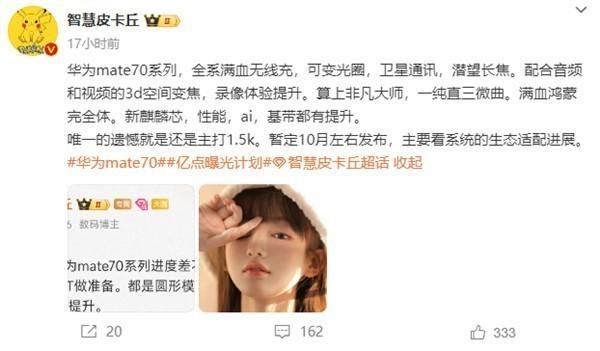 此外,华为Mate 70或将全系配备满血无线充电,支持卫星通信,配备潜望式长焦镜头和可变光圈。