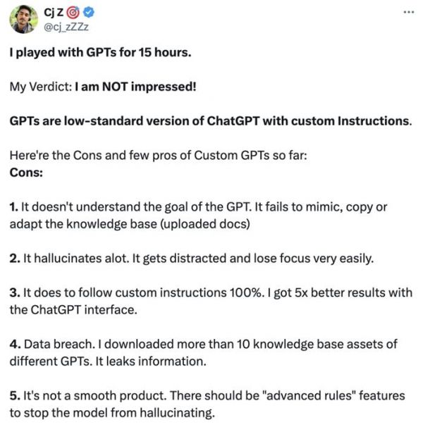但也正是由于创建门槛低,大家发现只用简单prompts调出来的定制GPT,体验其实和直接对话GPT-4没太大差别,甚至还是个“低配版”:它不能适应知识库、容易分心和产生幻觉;不能100%遵循自定义指令,反而“在ChatGPT界面得到的回答效果要好5倍”;本质相当于基础RAG平台,却最多只能传10个文件,未能提供向量数据库调用等功能。而且容易实现也就意味着容易被替代,几百万个GPTs同质化严重、良莠不齐,真正优秀的却少之又少。