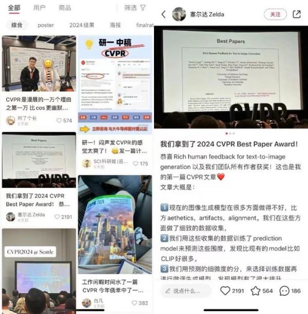 以上周学术界最爆火的大会CVPR为例,各种细节满满的现场直击、参会吐槽,居然都在小红书上最先出现,甚至CVPR的最佳paper获奖者之一,也率先在小红书分享了喜讯。