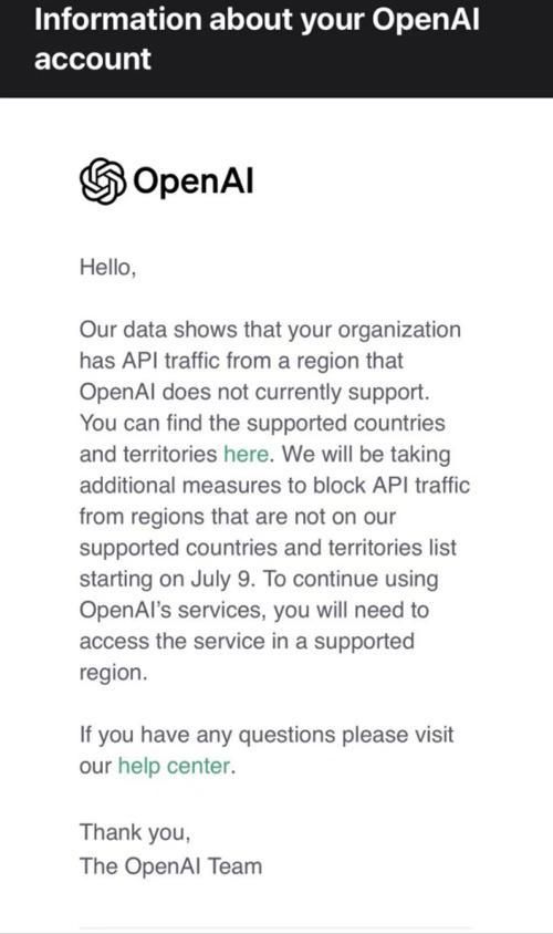 “根据数据显示,你的组织有来自OpenAI目前不支持的地区的API流量。从7月9日起,我们将采取额外措施,停止来自不在OpenAI支持的国家、地区名单上的API使用。”