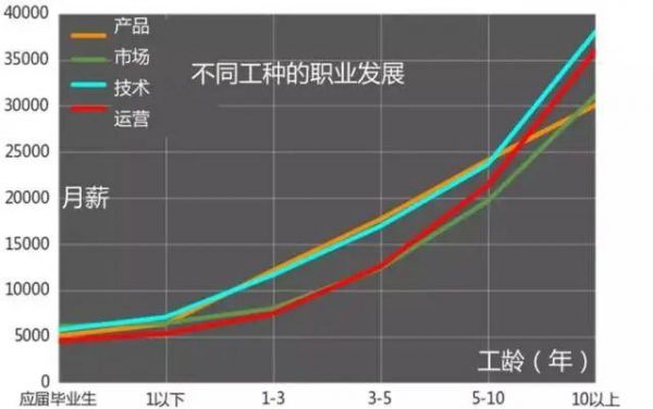 五年工作经验成为职业生涯的一个重要转折点,技术岗位的发展潜力显著超越产品岗位,而运营岗位的薪资也逐步提升。