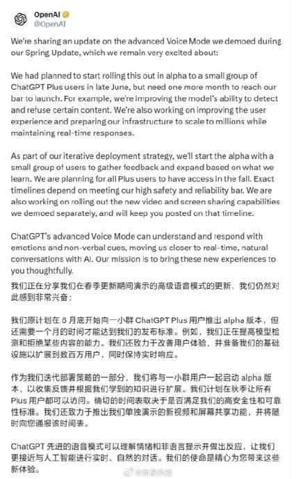 OpenAI推迟发布ChatGPT语音问答功能,检测及拒绝部分内容的能力仍待加强