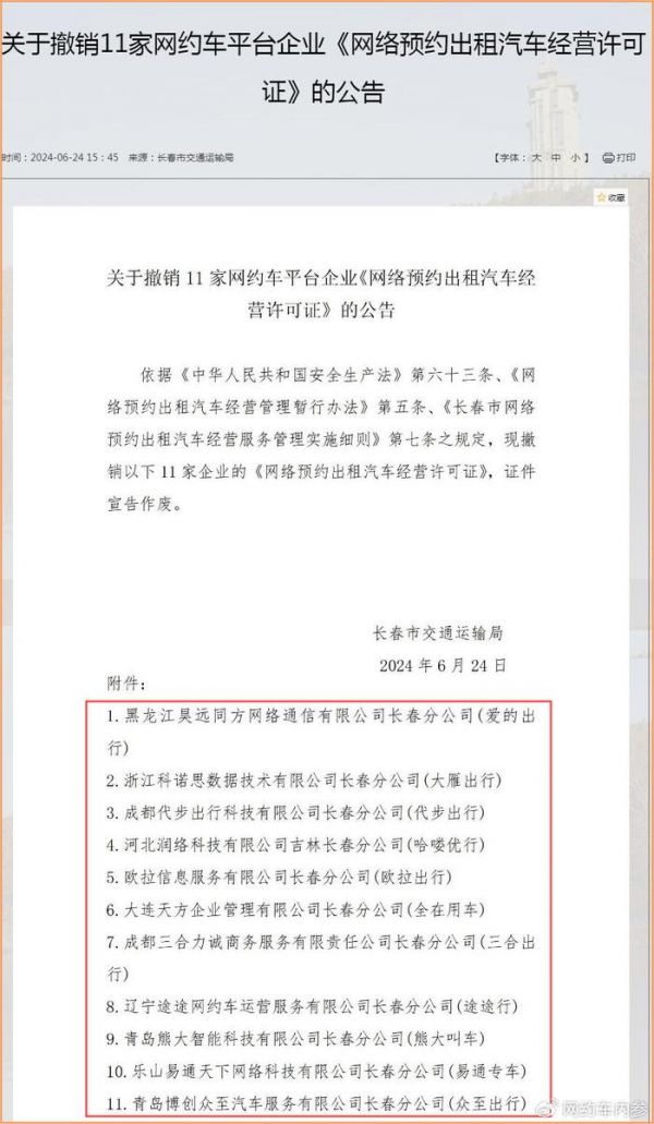 网约车内参讯(文/彭小伟)6月24日,长春市交通运输局公告撤销11家网约车平台经营许可证。