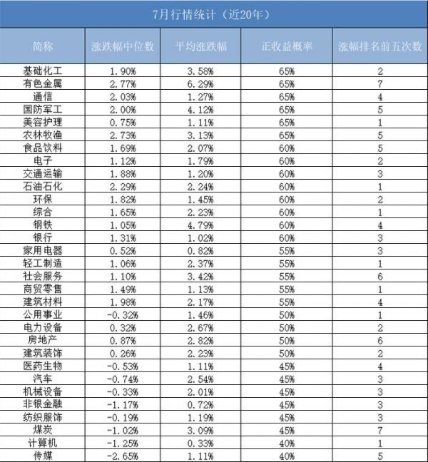 近20年申万一级行业7月份胜率比较高的行业是化工、有色、通信、军工。再结合这两天国外对我们AI的制裁,通信行业可能成为主线。