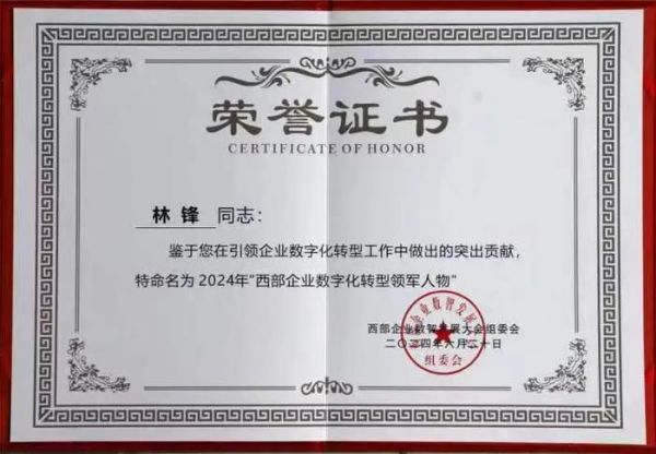 林锋总经理在引领数字化转型工作中做出突出贡献,荣获“2024年西部企业数字化转型领军人物”称号