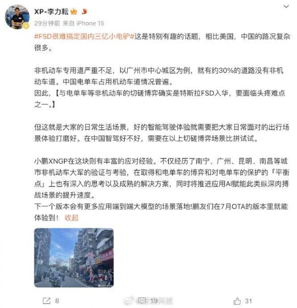 【#小鹏智驾负责人称特斯拉FSD搞不定国内电驴#:与电单车等非机动车的切磋博弈,是特斯拉FSD入华面临头疼难点之一】小鹏自动驾驶负责人@XP-李力耘 今日在微博发文称“FSD很难搞定国内三亿小电驴,这是特别有趣的话题,相比美国,中国的路况复杂很多。”