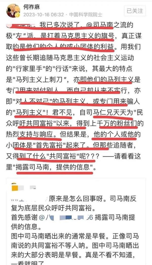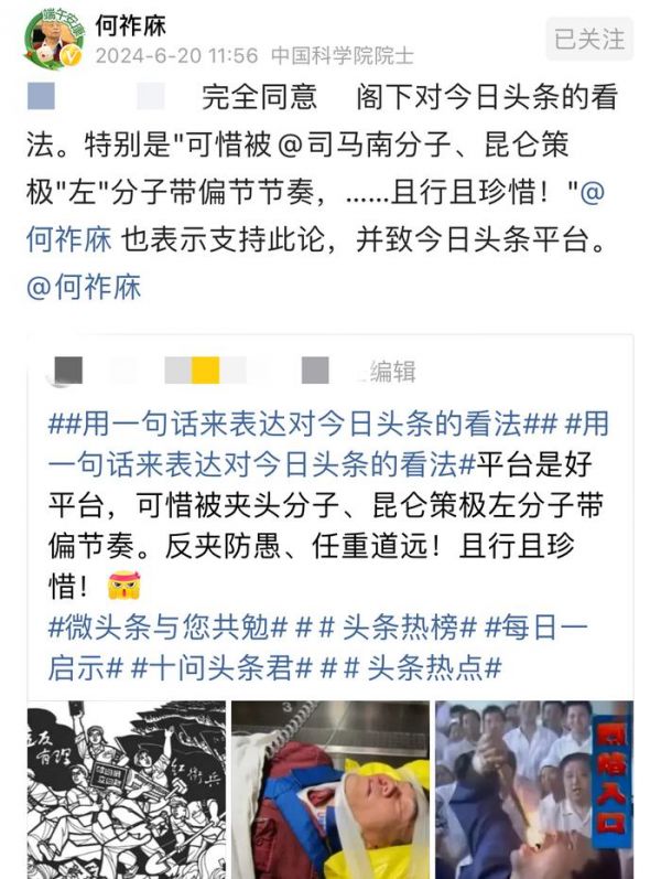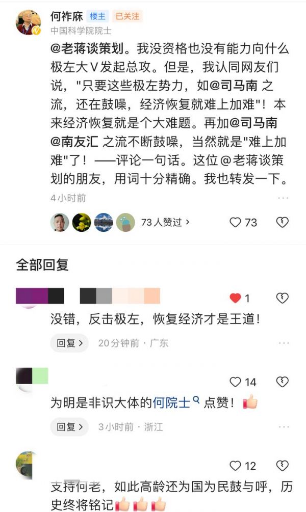 何院士看到之后,评论道:很对,这就是现在最大的问题——这种极左思潮已经泛滥成灾,可悲的是,他们还认为自己十分正确。