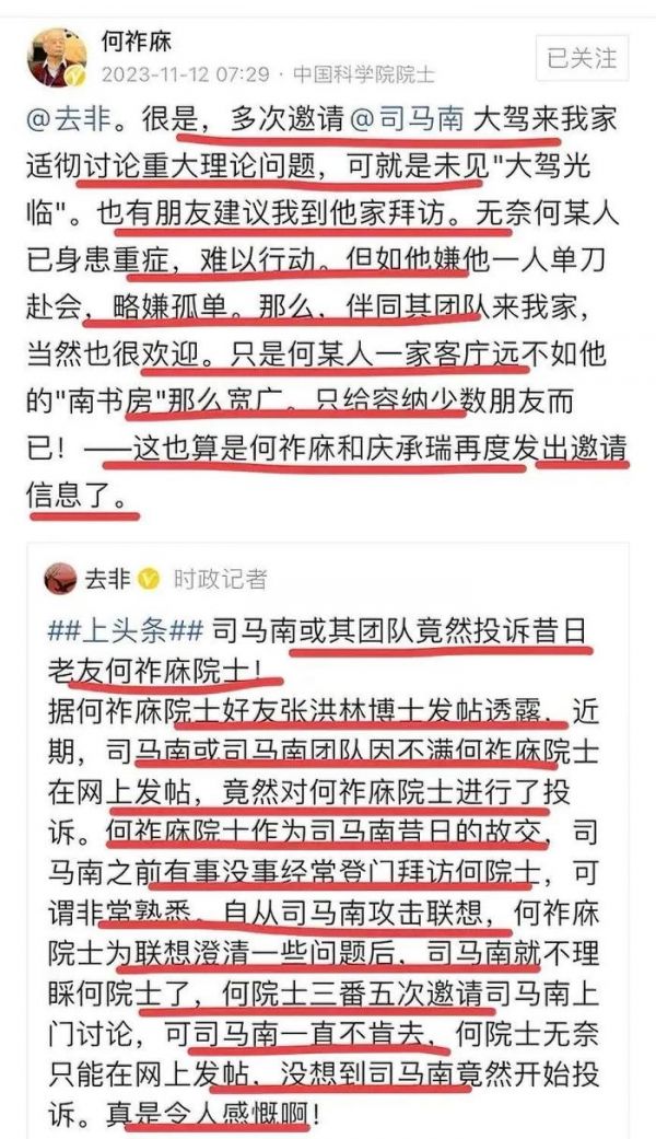 有网友质疑何老为什么总是针对司马,何院士说,其实这不是个人恩怨,而是在大是大非面前,他希望司马能悬崖勒马,回头是岸,他是想挽救这位几十年的老朋友,站好最后一班岗而已。