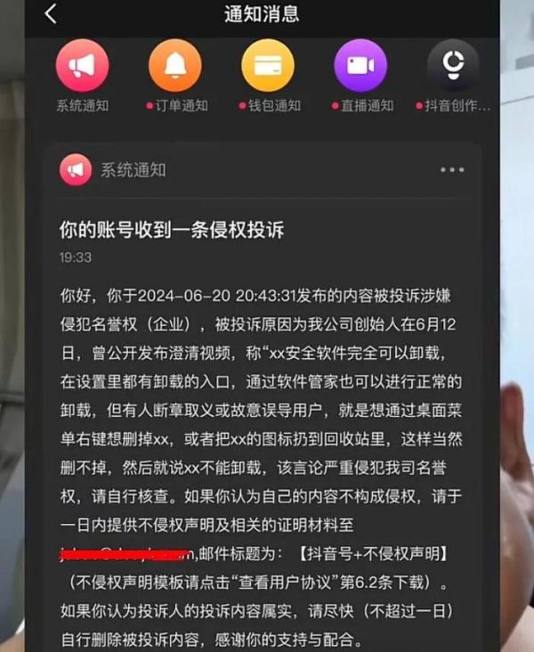 360在投诉原因指出,“我公司创始人在6月22日曾公开发布澄清视频,表示‘xx安全软件完全可以卸载,在设置里都有卸载入口,通过软件管家也可以进行正常的卸载。当有人断章取义或故意误导用户时,他们会试图通过桌面菜单右键删除XX,或将XX的图标扔进回收站,这样当然删不掉。然后就说不能卸载,这种言论严重侵犯了我公司的名誉权,请自行核查’。”