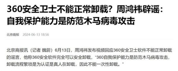 此前,360公司创始人、董事长兼CEO周鸿祎曾发布视频回应360安全卫士软件不能正常卸载的谣言。