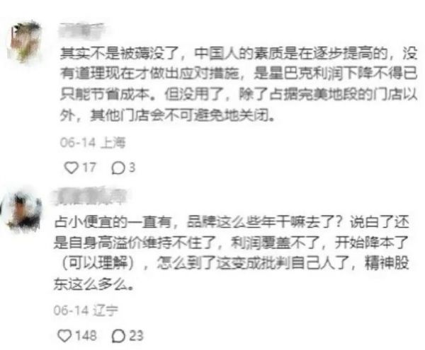 但也有网友认为,星巴克这是在把自身经营不善的矛盾转嫁到消费者身上。“说白了还是自身高溢价维持不住了,所以开始降本增效。”