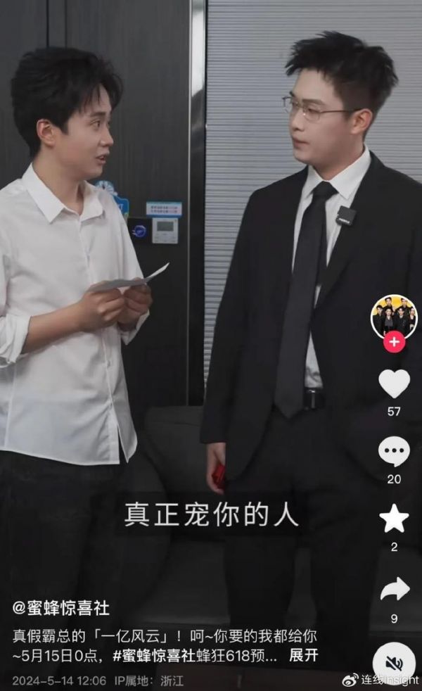 今年618期间,乘着短剧的东风,谦寻开始以“直播+短剧”的方式,试水大促,推出了《蜂总的37日独宠》这一作品,整合了直播和短剧的新玩法。预热期间,“蜜蜂惊喜社”多平台账号就同步更新了“霸总”系列短剧。