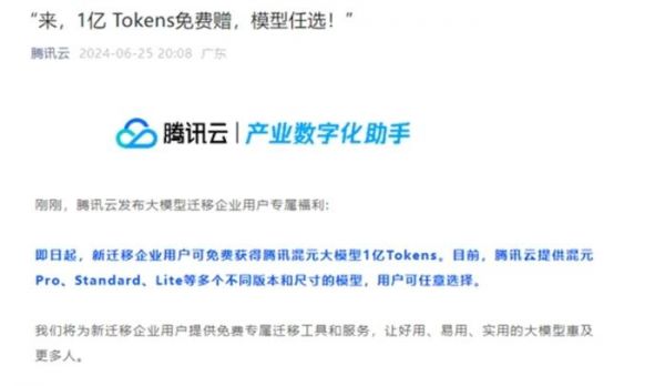 腾讯则为新迁移企业用户免费赠送1亿腾讯混元大模型tokens,并提供多个不同版本的模型供用户选择,包括混元pro、Standard、Lite等。迁移时间截至7月31日24时。