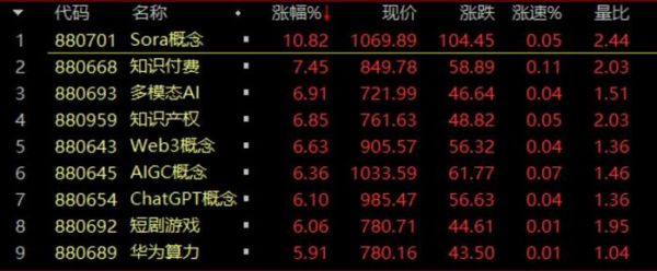 根据各个公司发布的迁移时间可以看出,国内基础大模型公司对用户的争抢已进入白热化,抢占的人越多,未来市场占有率就越大,激烈的氛围带动Sora概念、多模态AI、AIGC概念、ChatGPT概念等相关板块上涨,成分股纷纷飘红。