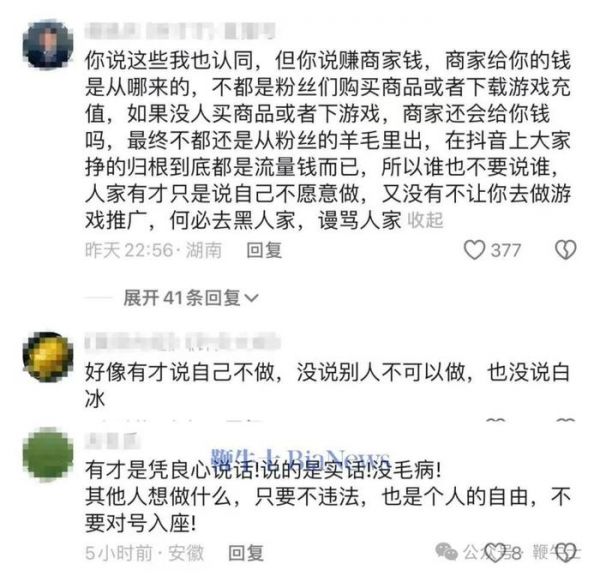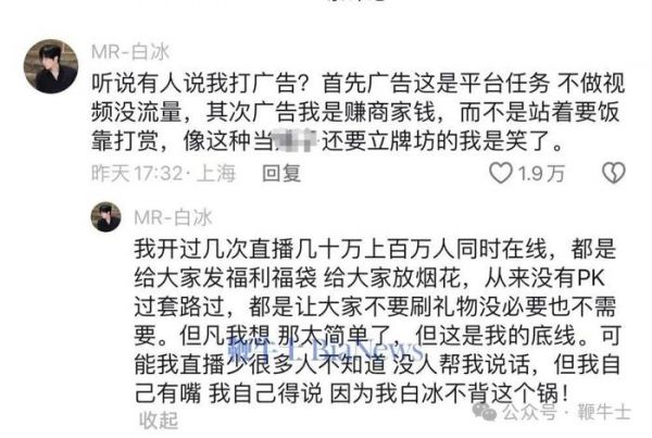 该言论在社交媒体上流传后,立即遭到了白冰了炮轰,后者在一段视频下方公开留言直言,首先广告这是平台任务,不做视频没流量,其次广告是赚商家钱,而不是站着要饭靠打赏,像这种当XX还要立牌坊的我是笑了。