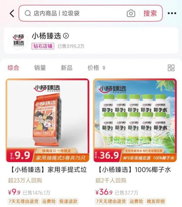 小杨臻选去年初就在抖音和淘宝同步开启旗舰店。两者目前主售的产品都与各自直播间定位相同,小杨臻选定位是追求极致性价比的商品,商品品类覆盖生活日用、休闲零食、个护家清等等。而东方甄选则更多放在农产品上。