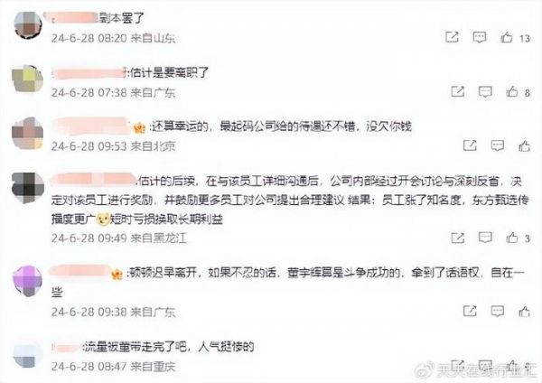 对此,有网友认为“剧本罢了”,也有网友猜测“估计是要离职了”,也有网友表示“还算幸运的,最起码公司给的待遇还不错,没欠你钱”,还有网友表示“这是为提升东方甄选传播度”。