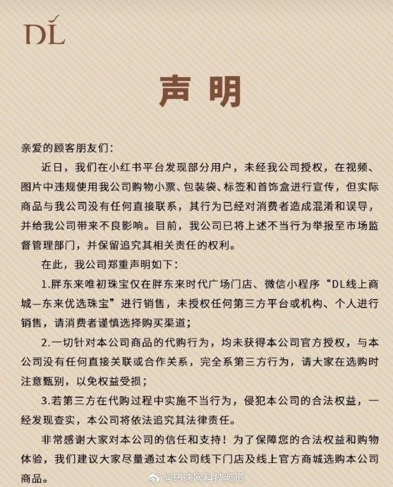 【#胖东来珠宝打假#】6月29日,胖东来唯初珠宝发布声明称,近日在小红书平台发现部分用户,未经该公司授权,在视频、图片中违规使用该公司购物小票、包装袋、标签和首饰盒进行宣传,但实际商品与该公司没有任何直接联系,其行为已经对消费者造成混淆和误导,并给该公司带来不良影响。