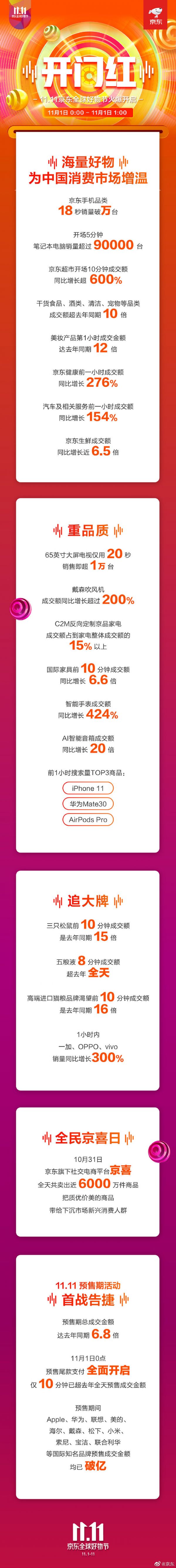据京东官方微博,11.11京东全球好物节开启,手机电脑数码产品热销。从北京时间11月1日零点开始,开场五分钟,笔记本电脑销量超过9万台。京东手机品类仅用时18秒销量就突破1万台。截止1点整,一小时内搜索量前三位的商品分别是iPhone 11、华为Mate 30和AirPods Pro。也是在一小时内,一加、OPPO和vivo的销量同比增长300%,智能手表成交额同比增长424%,AI智能音箱成交额同比增长20倍。