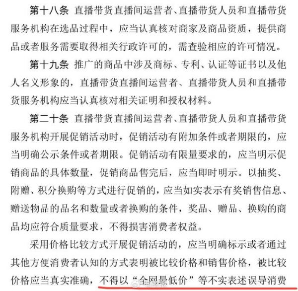 其中第二十条明确规定,直播带货直播间运营者、直播带货人员和直播带货服务机构,采用价格比较方式开展促销活动的,被比较价格应当真实准确,不得以“全网最低价”等不实表述误导消费者。