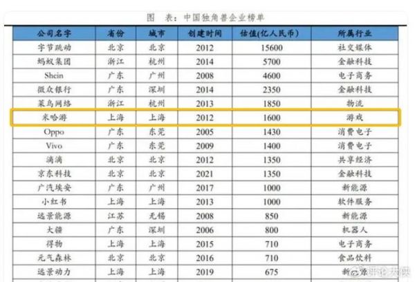 上海排名第一的独角兽:米哈游估值1600亿,位列中国独角兽企业榜单前十行列。致力于技术研发、探索前沿科技,在卡通渲染、人工智能、云游戏技术等领域积累了先进的技术能力。早在三年前,米哈游的总营收已突破了百亿元大关,而且超过一半的收入来自海外。2022年净利润约161.45亿,去年旗下的《原神》蝉联出海手游年度收入冠军。
