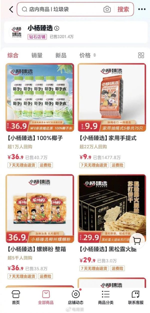 截至目前,“小杨臻选”抖音旗舰店累计销量为3201.4万,其中一款定价仅为9.9元的垃圾袋累计销量达到1477.8万单。