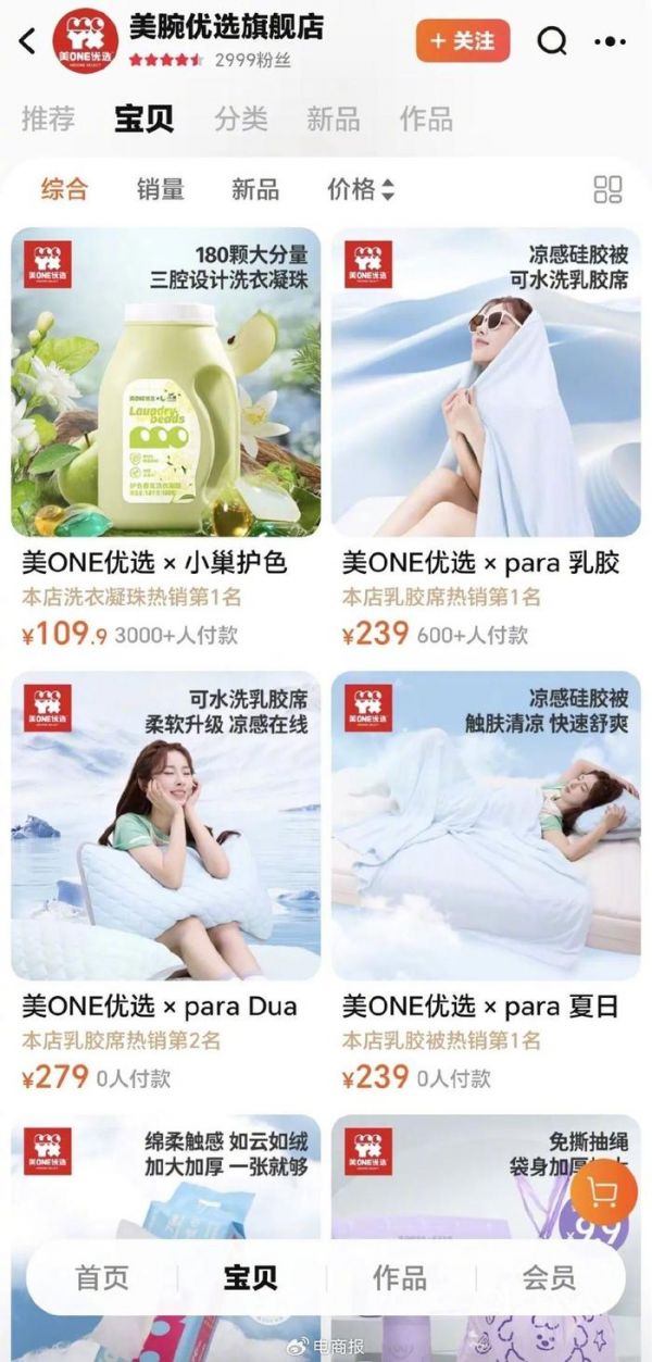 6月15日,美腕正式推出了美腕优选天猫旗舰店。自上线以来,该店铺总计上线了7款商品,包括洗衣凝珠、毛巾、硅胶凉席、硅胶被等,其中销量最高的是由李佳琦推荐过、客单价在百元左右的洗衣凝珠,累计销量已超3000件;其次是乳胶被累计销量超600件。