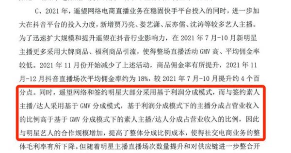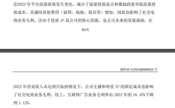 在今年3月举办的“2024(第19届)商业地产行业发展论坛”中,谢如栋提及,“遥望科技有200多名主播,其中有60多位签约合作的明星主播”。这注定遥望科技培养主播的成本不会低,譬如2023年遥望科技社交电商毛利率变低,对此遥望解释称原因之一是2023年营业收入未达到目标的情况下,主播和明星IP的固定成本影响了社交电商业务毛利。