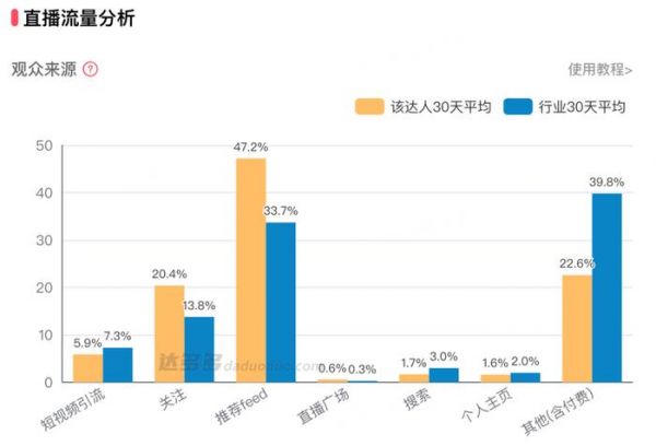 达多多数据显示,近一个月以来,王祖蓝直播13场,直播间流量近一半来自抖音推流,近四成来自包含付费流量在内的其他流量,这部分远高于行业平均的24%,但是销售额却为500万元-750万元。而直播了29场的舒畅,尽管取得了1亿+的带货额,但是其来自包含付费流量在内的其他流量占比为42%。