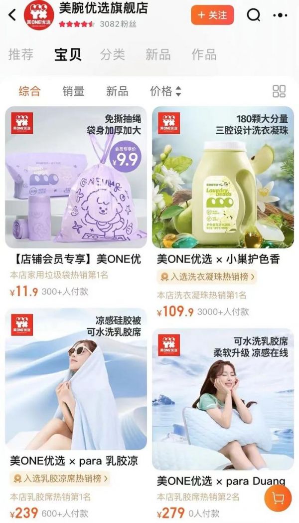 随着市场上对李佳琦呼声的减弱以及李佳琦喊出“今年618很难”,美腕也在最近上线了美腕优选天猫旗舰店,进军自有品牌,以寻找更多增长的可能。目前,美腕旗舰店粉丝约3000人,带有“美ONE优选”标志的7款产品上线美腕旗舰店,包括洗衣凝珠、乳胶被、硅胶凉席等,其中销量最高的是售价109.9元的洗衣凝珠。