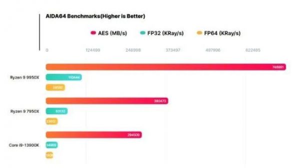 那么作为竞争者的英特尔呢?虽然没有找到i9-14900K的AES加密测试数据,但是i9-13900K的成绩却仅为294509MB/s,而在实测中i9-14900K的性能对比i9-13900K并没有太大的提升(5%左右),以此推断,Ryzen 9 9950X的AES加密性能将是i9-14900K的1.5倍左右。