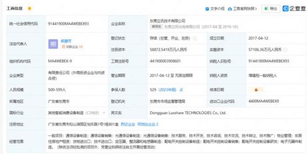 东莞立讯技术有限公司成立于2017年4月,法定代表人为熊藤芳,是一家通讯设施和企业级互连产品提供商。公司主要生产经营基站天线、滤波器、RRU 等通讯设备, 以及连接器、连接线、光模块、AOC等互连产品,覆盖无线通信基站、数据中心、服务器、交换机、路由器等应用领域,提供完整的从无线连接,到电连接、光连接、热管理等完整互连解决方案。