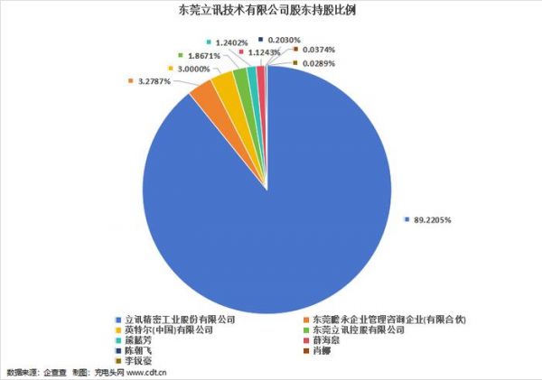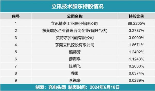 立讯技术公司共有 9 名股东,其中持股比例排名前三的股东分别是立讯精密工业股份有限公司 、东莞瞻永企业管理咨询企业(有限合伙)、英特尔(中国)有限公司。立讯精密工业股份有限公司股东持股比例达89.2205%,是最大的股东。英特尔公司作为最近新入股的股东,持股比例为3%。
