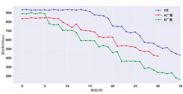 实际测试是检验这套方法最好的方法。得翼通信给出的测试数据,在头部运营商实验室做的对比测试,三条曲线代表三个路由器,绿色是运营商提供的路由器,蓝色是在运营商的路由器里增加RPU芯片性能数据,红色是网上能买到的最贵的路由器之一。