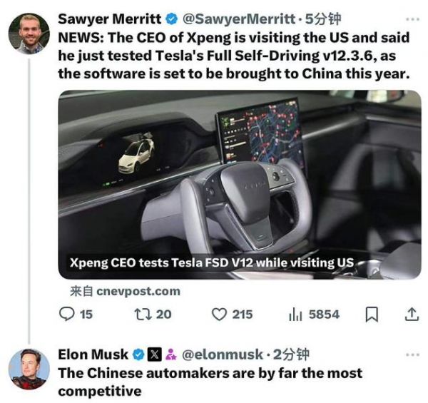 6月20日,他在微博上公开了自己在美国的长行程,表示自己很愿意做一下特斯拉FSD和Waymo的测试。此事随后被海外相关的博主在社交平台上转发,而特斯拉CEO埃隆马斯克很意外地出现在了评论中,也算是对小鹏的一种隔空鼓励。马斯克很“高情商”地表示,中国汽车制造商是迄今为止最具竞争力的。