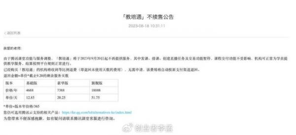 当然腾讯课堂的停止运营并不是没有先兆的,腾讯课堂早期是抽佣的方式,后来他们推出了一个教培通的产品,开始向入驻的机构开始收取年费,提供一些功能和相关的服务!但也有机构发现,从2023年开始,教培通不再支持续费了!