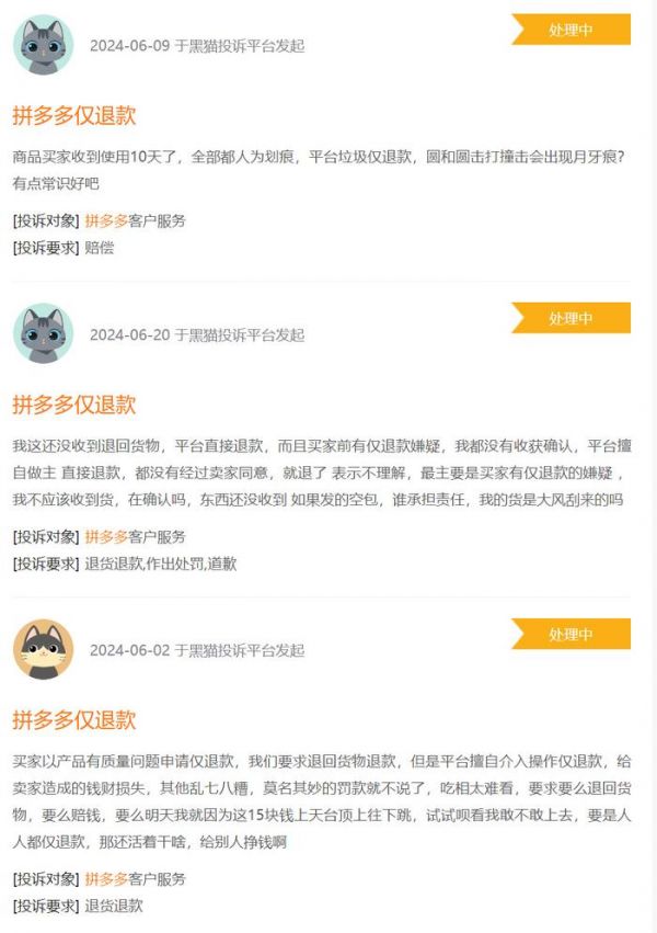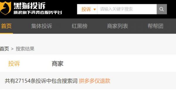 在黑猫投诉上可以看到,关于拼多多仅退款的投诉量就超过了25000条,这个量级是很大的。