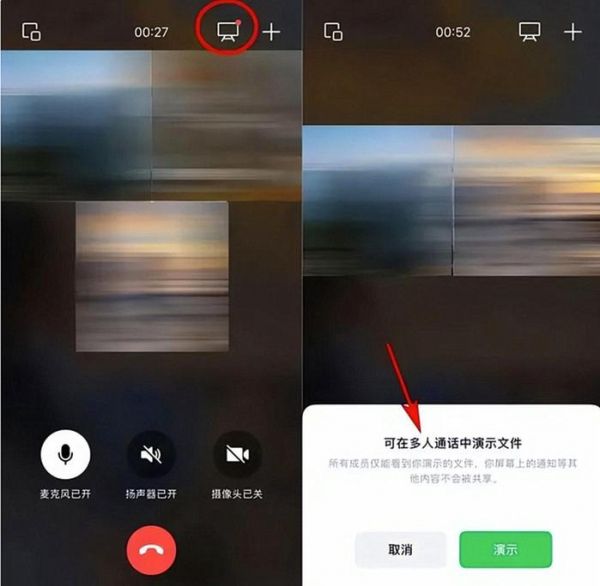 而且还有新增的“文稿演示”,比如在多人通话时,这个功能可以让所有成员仅能看到你演示的文件,你屏幕上的通知等其他内容不会被共享。