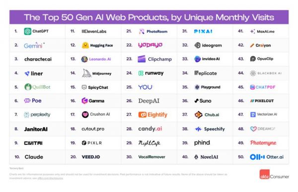 在2023年6月,ChatGPT等LLM占据了大部分的网络流量。而在最新分析中,两个新的类别加入列表:音乐和生产力(包括研究、编码辅助和文档摘要等任务)。