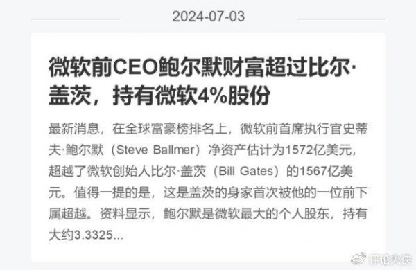 2024年7月初,微软前CEO史蒂夫·鲍尔默身价反超微软公司创始人比尔盖茨,成为了全球第六大富豪,身价约1572亿美元(折合人民币约1.14万亿)。鲍尔默并非普通的职场人士。他以充满激情的个性和对工作的极度投入著称,这种性格特质让他在微软的职业生涯中留下了深刻的烙印。