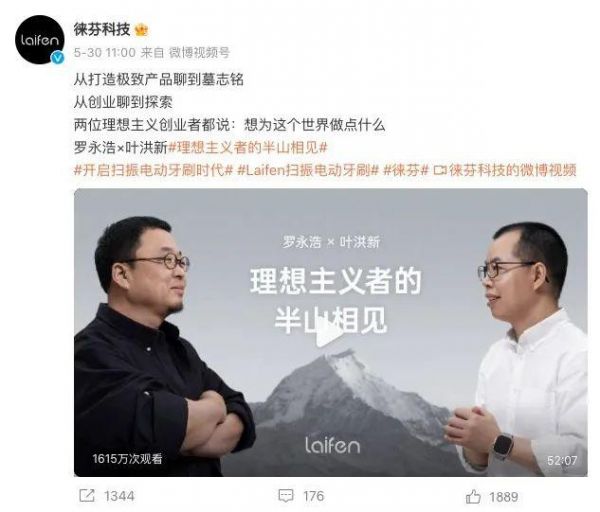 图源:徕芬官微 2024年5月30日,徕芬发布了公司创始人叶洪新和网红罗永浩的对谈视频,重点讨论了徕芬新推出的扫振电动牙刷。随后,徕芬又发布数张海报,“感谢老罗的多次推荐”。
