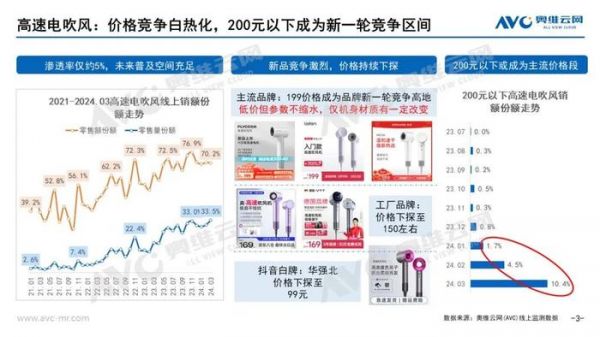 图源;奥维云网 奥维云网线上监测数据显示,2023年4月,高速吹风机市场中200元以下的产品销量销额显著增长,零售额占比达12.7%,零售量占比更是高达33.7%。可以发现,200元以下的高速吹风机正逐渐成为市场的主流。