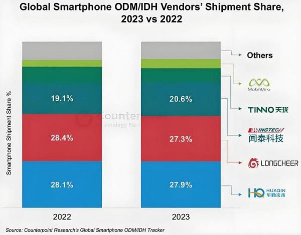 2020~2023年,华勤连续四年斩获全球智能手机ODM/IDH厂商排名第一的荣誉,成为行业内无可争议的一哥;并且进一步强化了2+N+3的王牌矩阵烙印,成为一个全球范围内的专业智能手机、笔电、平板、智能穿戴、AIoT及服务器等多品类ODM巨头。